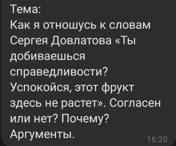 Я отношусь к фразе Сергея Довлатова "Ты добиваешься справедливости? Успокойся, этот фрукт здесь не растет." очень сомнительно. Ведь если рассуждать с точки зрения С. Довлатова, добиваясь справедливости в месте где ее нет - это бесполезное дело. И я в корне с этим не согласен. Ведь справедливости можно добиться всегда и везде, главное этого хотеть и действовать. Например, если в школе между учениками нету справедливости, то ее можно добиться просто поговорив с каждым человеком, подружить весь класс(по возможности) и в любом случае справедливость появиться, ведь среди друзей не может быть недоверия и несправедливости. Справедливость это как саженец дерева, если его просто посадить в землю-оно скорее всего просто погибнет, но если за ним ухаживать, поливать, удобрять, то в конце концов вырастет большое дерево которое будет расти не одно десятилетие.