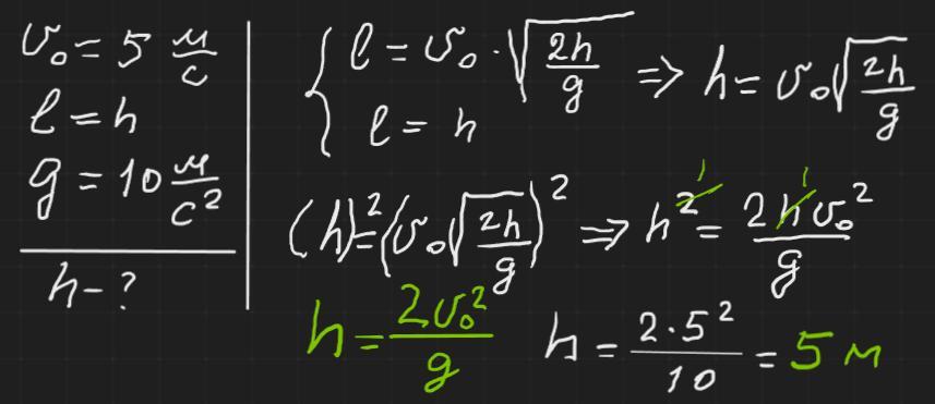 Дальність польоту тіла, яке кинуто горизонтально зі швидкістю 5 м/с, дорівнює висоті, з якої кинули тіло. Чому дорівнює ця висота?
