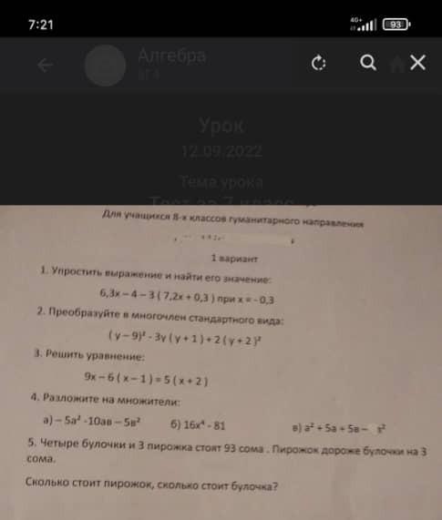 1. Упростить выражение и найти е 6,3x-4-3(7,2х+0,3 ) прих-0,3 2. Преобразуйте в многочлен стандартного вида: (v-9)-3y(y+1) +2(x+2) 3. Решить уравнение: 1 вариант 9x-6(x-1)-5(x+2) 4. Разложите на множители: a)-5a²-10an-58² 6) 16x¹-81 a) a²+5a + 58 - ре 5. Четыре булочки и 3 пирожка стоит 93 сома. Пирожок дороже булочки на 3 сома. Сколько стоит пирожок, сколько стоит булочка?
