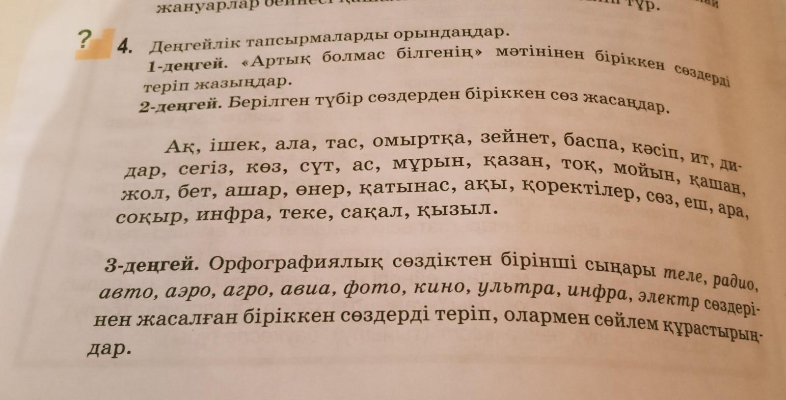 4. Деңгейлік тапсырмаларды орындандар. 1-деңгей. «Артық болмас білгенің» мәтінінен біріккен сөздерді терiп жазыңдар. 2-деңгей. Берілген түбір сөздерден біріккен сөз жасаңдар. Ақ, ішек, ала, тас, омыртқа, зейнет, баспа, кәсіп, ит, ди дар, сегіз, көз, сүт, ас, мұрын, қазан, тоқ, мойын, қашан, жол, бет, ашар, өнер, қатынас, акы, қоректілер, сөз, еш, ара, соқыр, инфра, теке, сакал, кызыл. 3-деңгей. Орфографиялық сөздіктен бiрiншi сыңары теле, радио, авто, аэро, агро, авиа, фото, кино, ультра, инфра, электр сөздері нен жасалған біріккен сөздерді теріп, олармен сөйлем құрастырын дар. пожалуйста