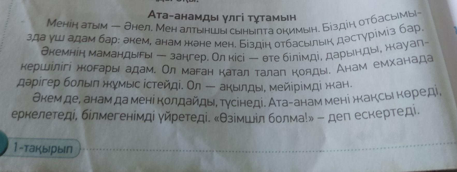 9-тапсырма. Диалогті тыңда. Сұраққа жауап бер. кімдер? 1. Сөйлесіп отырған 2. Олар кімді үлгі тұтады? 3. Кім әкесі туралы айтты? Оның әкесі — қандай адам? кандай адам? 4. Кім анасы туралы айтты? Оның анасы - қандай адам?