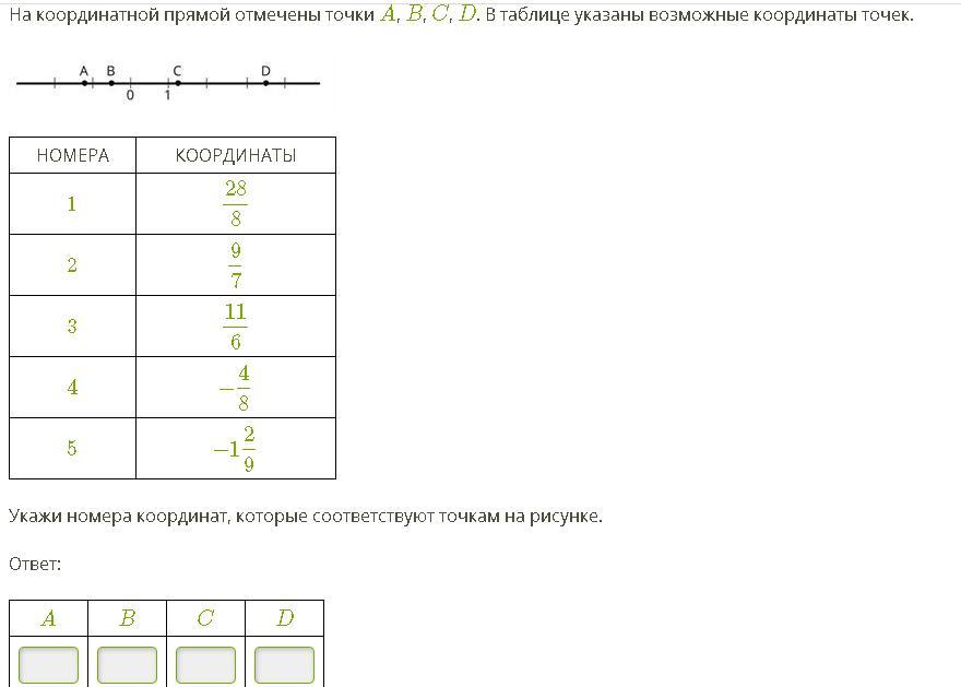На координатной прямой отмечены точки A, B, C, D. В таблице указаны возможные координаты точек.
