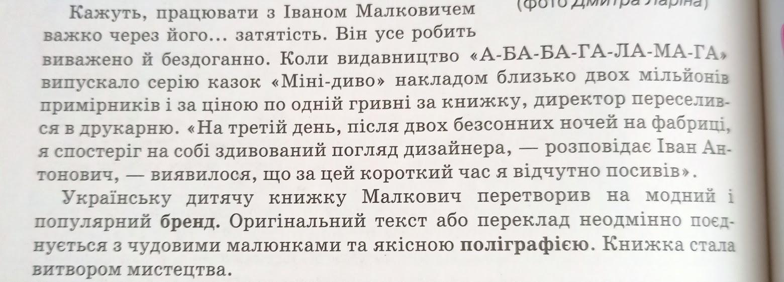 іменники-Іван Малкович, видавництво,серію, казок, примірників,ціною, гривні, книжку, директор, друкарня, погляд, дизайнер,Іван Антонович, книжку, бренд,текст,переклад,малюнками, поліграфія,витвір.