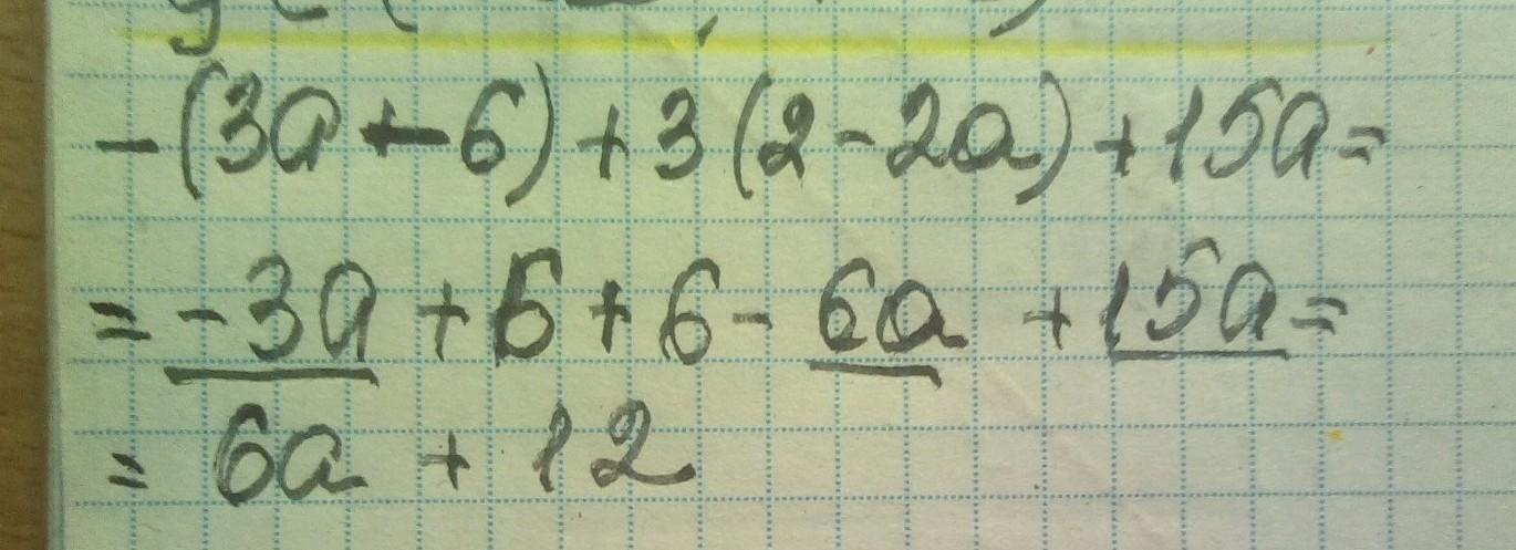 спростіть вираз:-(3a-6)+3(2-2a)+15a