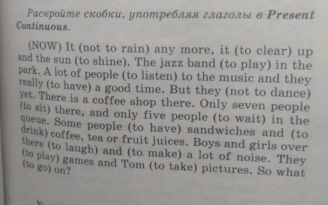 it's not raining, it's clearing up, sun is shining, band is playing, people are listening, they really are having, they aren't dancing yet, 7 people are sitting there, 5 people are waiting, some people are having and drinking, there are laughing and making, they are playing and Tom is taking, so what is going on