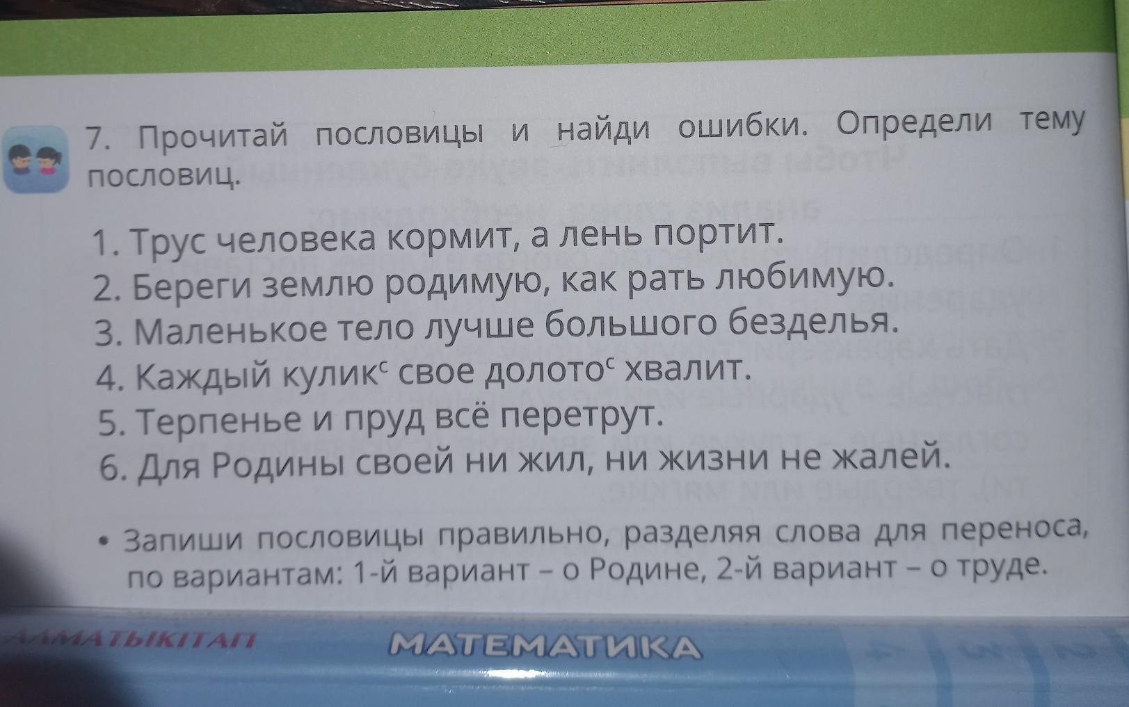 7. Прочитай пословицы и найди ошибки. Определи тему пословиц. 1. Трус человека кормит, а лень портит. 2. Береги землю родимую, как рать любимую. 3. Маленькое тело лучше большого безделья. 4. Каждый кулик свое долото хвалит. 5. Терпенье и пруд всё перетрут. 6. Для Родины своей ни жил, ни жизни не жалей. • Запиши пословицы правильно, разделяя слова для переноса по вариантам: 1-й вариант - о Родине, 2-й вариант - о труде.
