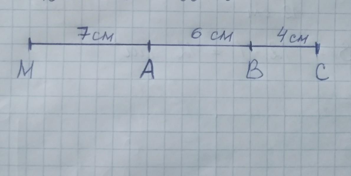 Точки А і В внутрішні точки відрізка МС, до того ж точка А лежить між точками М і В. Чому дорівнює довжина відрізка МС, якщо МА=7 см, АВ=6 см, ВС=4 см СРОЧНО!!!!! Даю 100 Баллов