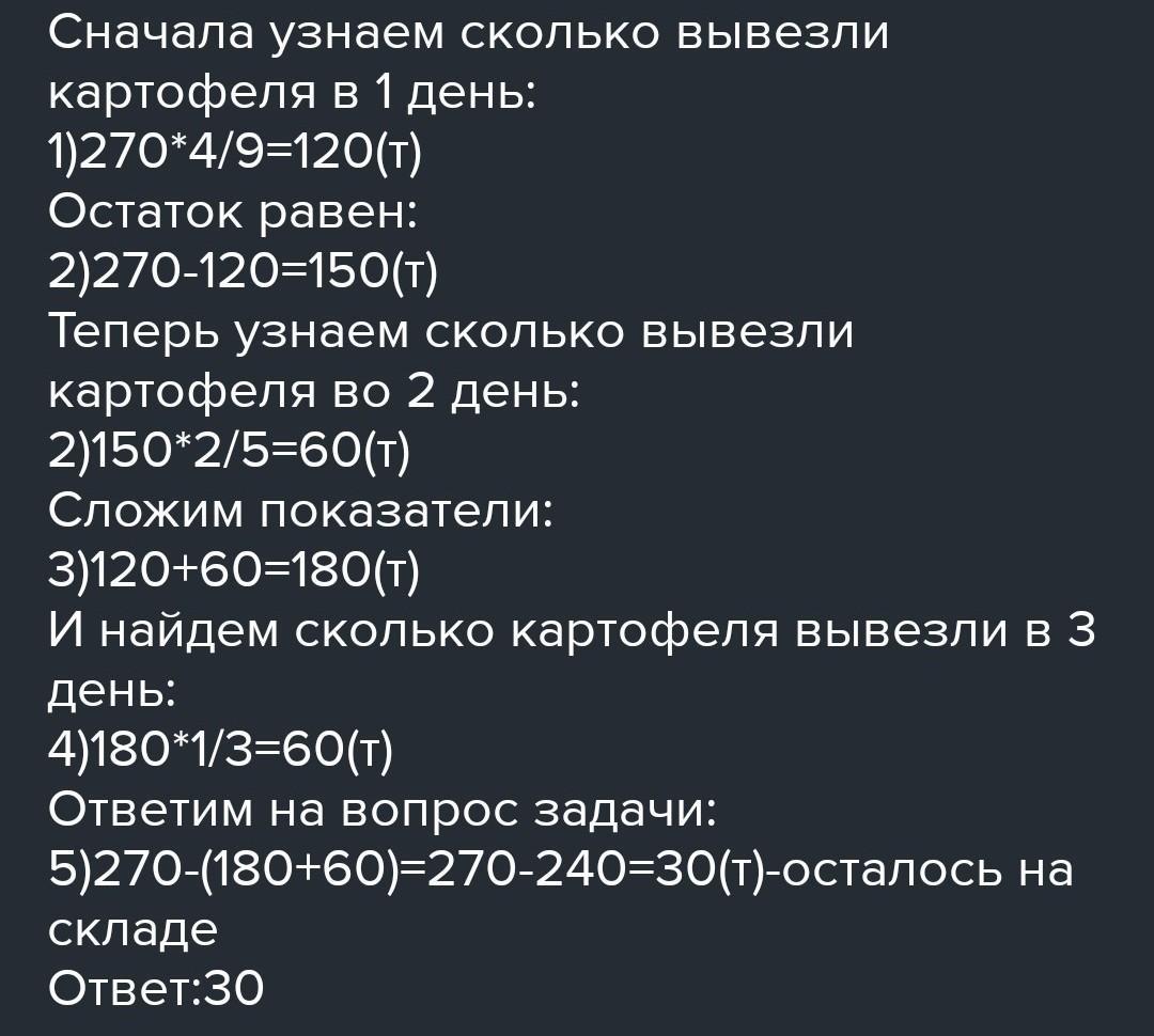 на базе было 270 цистерн картофеля. за 1 день вывезли 4/9, а во второй 9/30 от того что осталось. сколько картофеля осталось на базе?