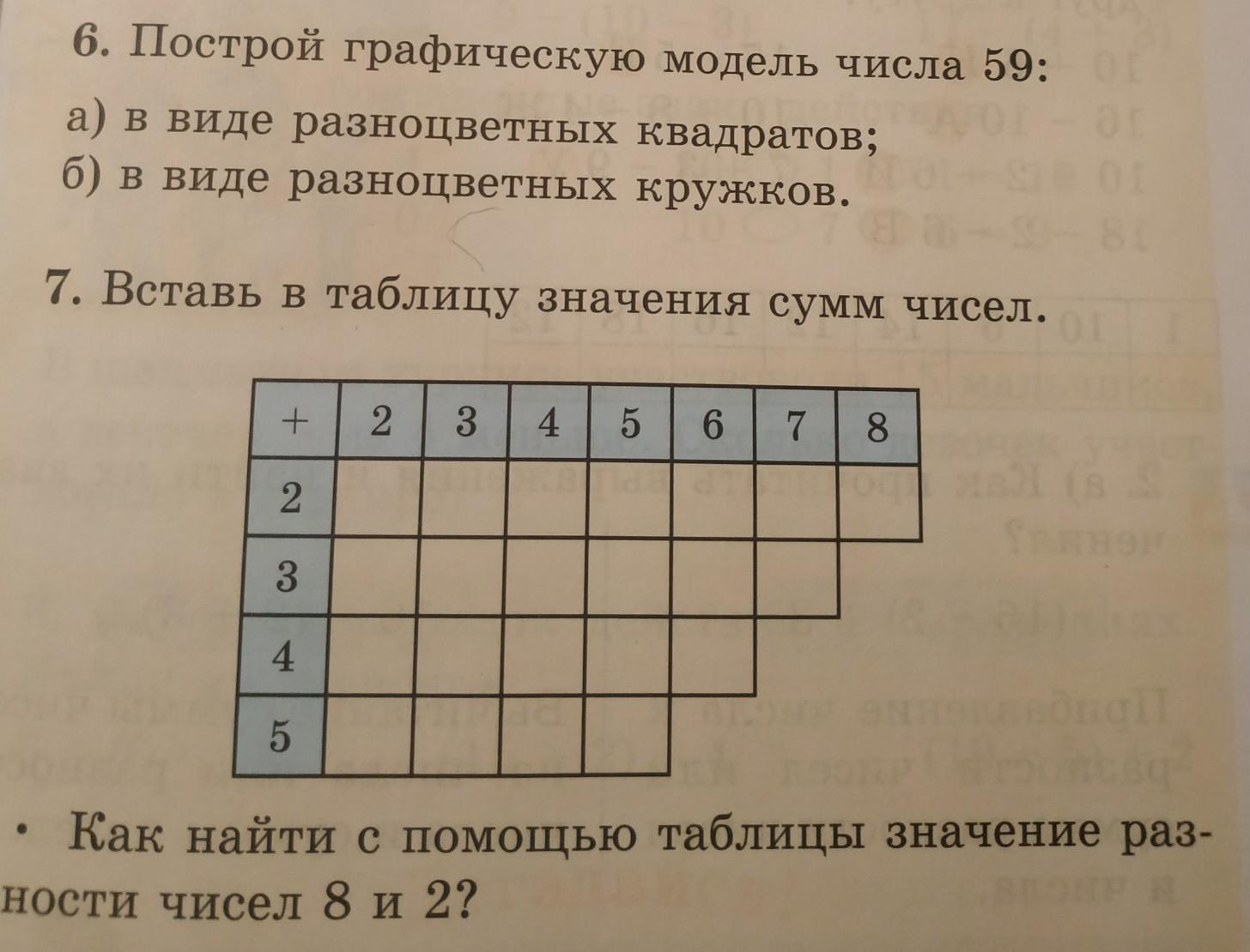 6. Построй графическую модель числа 59: 0 a) в виде разноцветных квадратов; б) в виде разноцветных кружков. 7. Вставь в таблицу значения сумм чисел. ● + 2 3 4 5 2 3 4 56 7 8 OL вс Как найти с помощью таблицы значение раз- ности чисел 8 и 2?