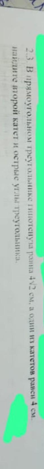 2.3 В прямоугольном треугольнике гипотенуза ранна 4√2 см, а один из катетов равен 4 см. найдите второй катет и острые углы треугольника.