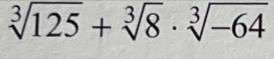 \displaystyle\bf\\\sqrt[3]{125} +\sqrt[3]{8} \cdot\sqrt[3]{-64} =\sqrt[3]{5^{3} } +\sqrt[3]{2^{3} } \cdot\sqrt[3]{(-4)^{3} } =5+2\cdot(-4)=5-8=-3