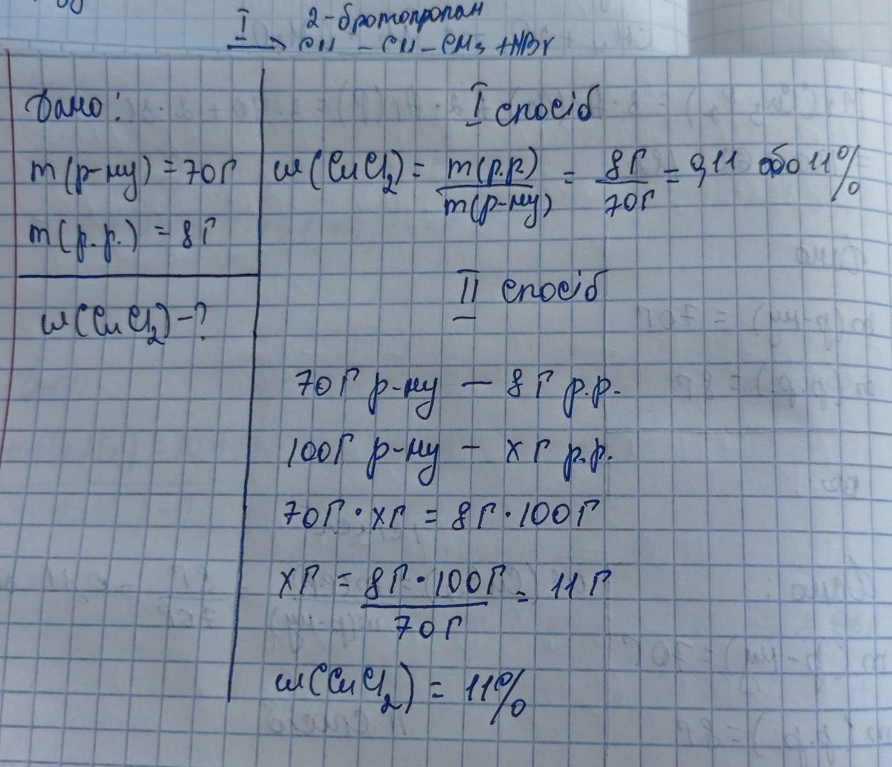 Розрахуй масову частку купрум хлориду в розчині масою 70 г, якщо маса розчиненої речовини — 8 г.