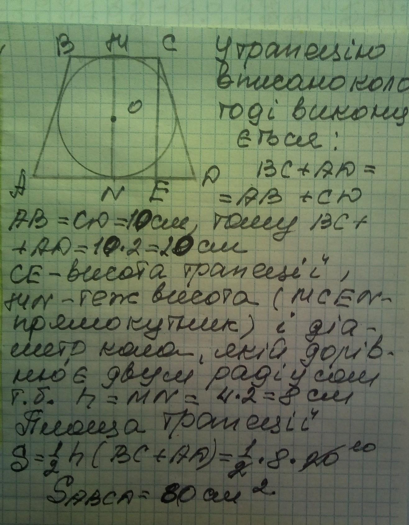 Знайди площу рівнобічної трапеції, описаної навколо кола радіусом 4 см, якщо відомо,
