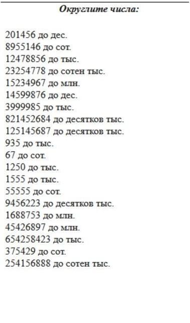 Округлите числа: 201456 до дес. 8955146 до сот. 12478856 до тыс. 23254778 до сотен тыс. 15234967 До млн. 14599876 до дес. 3999985 до тыс. 821452684 до десятков тыс. 125145687 до десятков тыс. 935 до тыс. 67 до сот 1250 до тыс. 1555 до тыс. 55555 до сот 9456223 до десятков тыс. 1688753 до млн. 45426897 до млн. 654258423 до тыс. 375429 до сот 254156888 до сотен тыс.