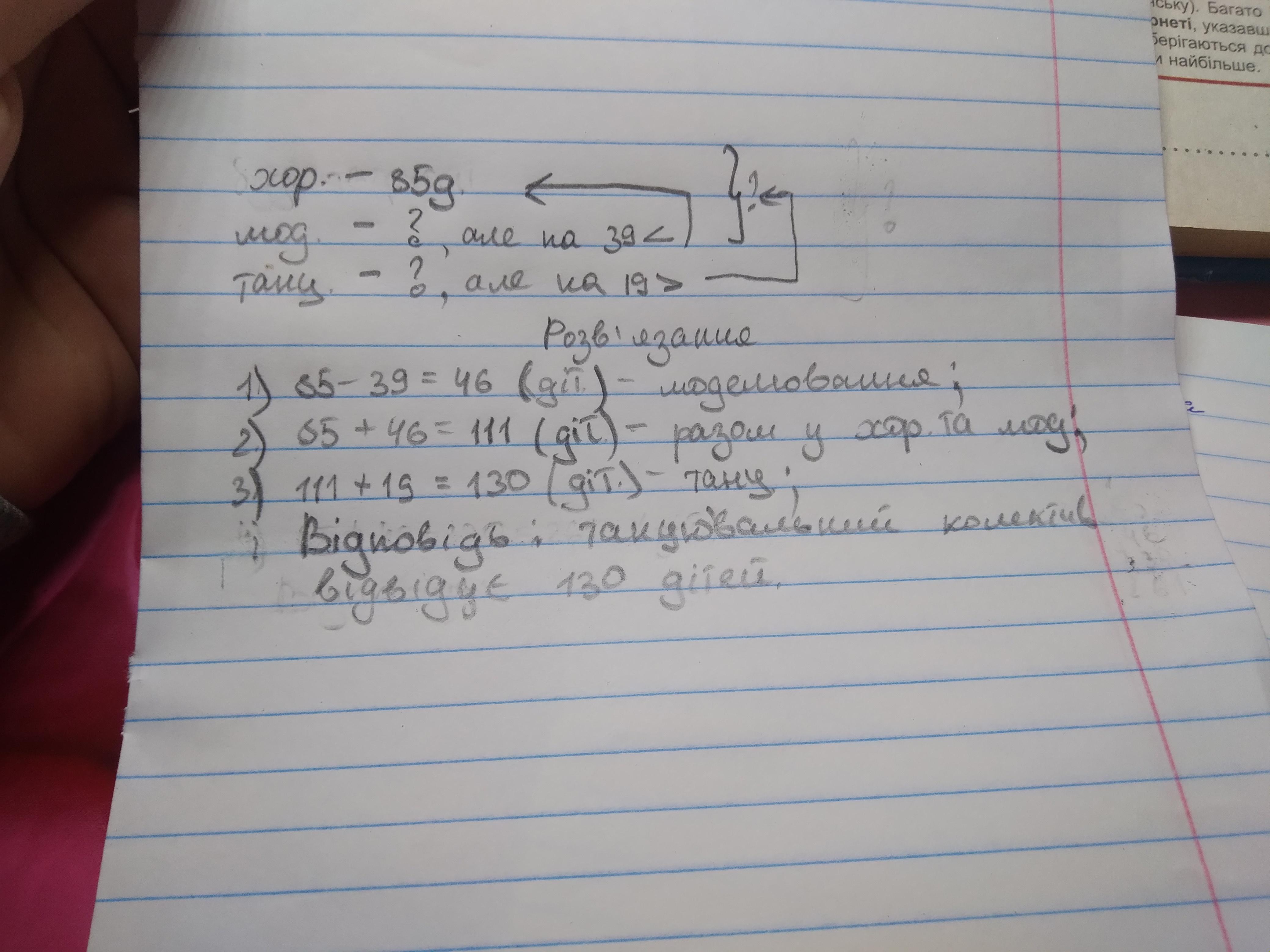89. Розв'яжи задачу складанням виразу. У хорі Будинку творчості 85 дітей, у гуртку з моделювання на 39 дітей менше, ніж у хорі, а в танцювальних колективах на 19 дітей більше, ніж у хорі й гуртку з моделювання разом. Скільки дітей відвідують танцювальні колективи? Зроби короткий запис задачі.