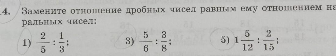 Замените отношение дробных чисел равным ему отношением натуральных чисел: 1) 2 1 3 - 5 3 ;3) 5 3 6 ; 5) 1- 5 2 12 : 15 ; срочно желательно по фото
