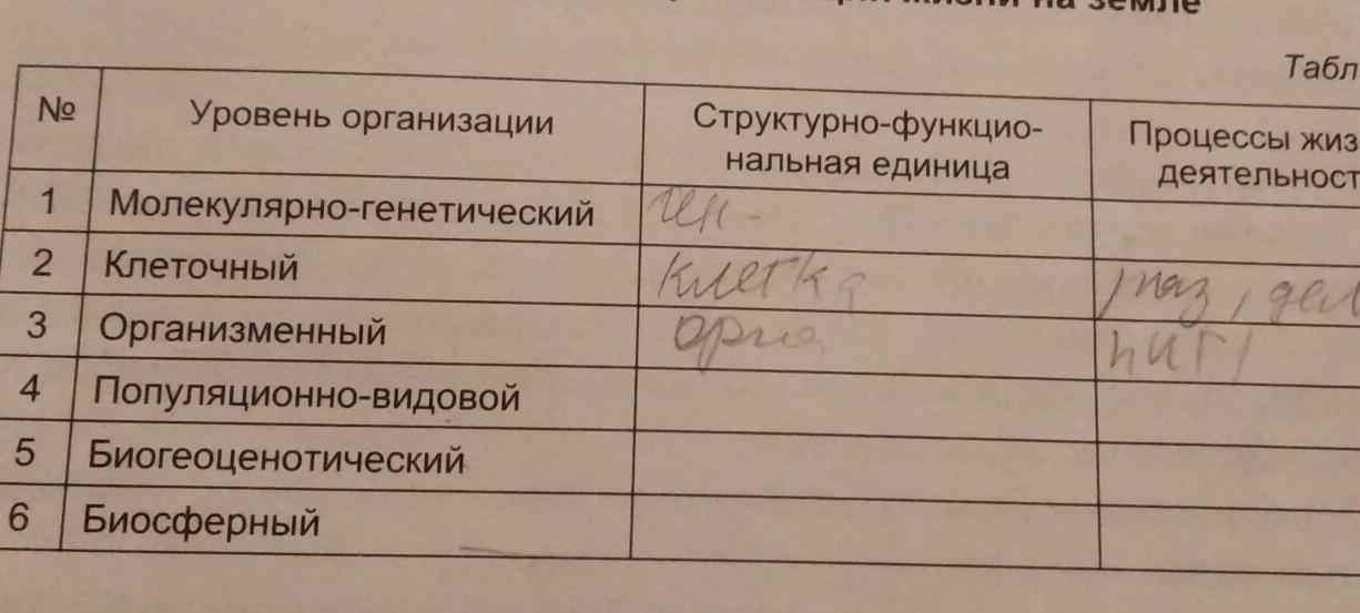 No Основные уровни организации жизни на земле 23 Уровень организации 1 Молекулярно-генетический Клеточный Организменный 4 Популяционно-видовой 5 Биогеоценотический 6 Биосферный Структурно-функцио- нальная единица клетка орга Таблица 2 Процессы жизне- деятельности у наздел пос ниг
