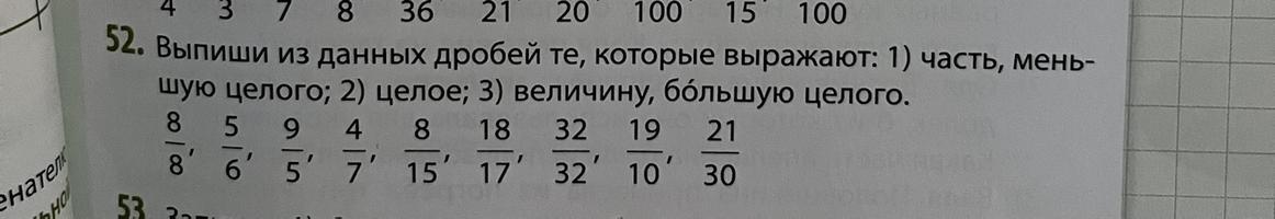 8\8 ціле , 5\6 меньше цілого , 9\5 більше цілого , 4\7 меньше цілого , 8\15 меньше цілого , 18\17 більше цілого , 32\32 ціле , 19\10 більше цілого , 21\30 меньше цілого .