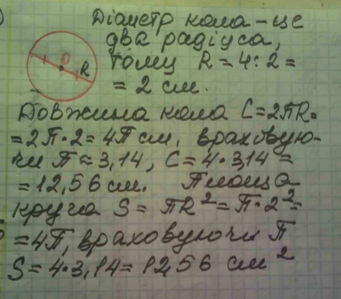 Знайдіть довжину кола та площу круга, якщо діаметр дорівнює 4 см​