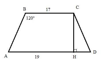 Основи рівнобічної трапеції ABCD вiдповiдно дорівнюють 17 см і 19 см. а тупий кут - 120°. Знайти площу трапеції.