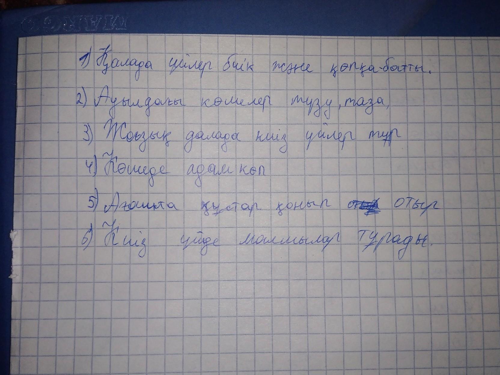 Жаттығайық 4. Жақшаны ашып жаз. Үлгі: Қалаларда үйлер өте көп. 1. (Қала) үйлер биік және көпқа- батты. 2. (Ауыл) көшелер түзу, таза. 3. (Жазық дала) киіз үйлер тұр. 4. (Көше) адам көп. 5. (Ағаш) құстар қонып отыр. 6. (Киіз үй) малшылар тұрады.