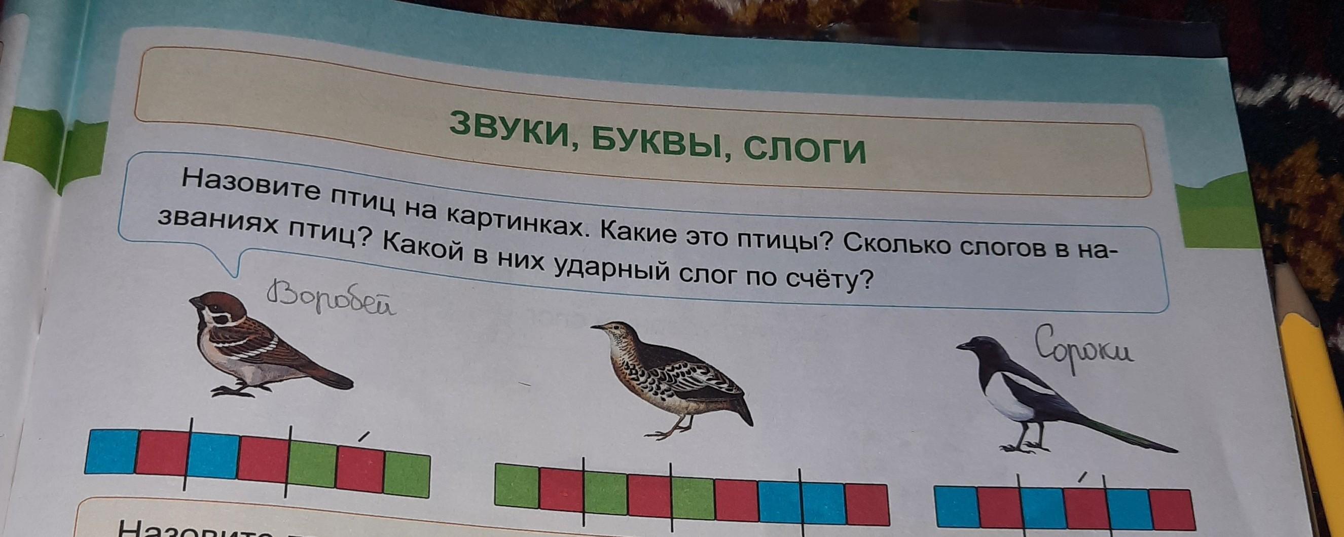во-ро-бей 3 слога, дя-тел 2 слога, со-ро-ка 3 слога