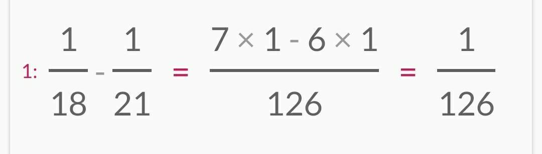 Нужно найти общий знаменатель, для этого мы 18 и 21 должны умножить на такие числа, чтобы получилось в итоге одно число, 18 умножаем на 7, а 21 умножаем на 6, в итоге получается (я дробь буду писать по другому) 7/126 - 6/126 = 1/126