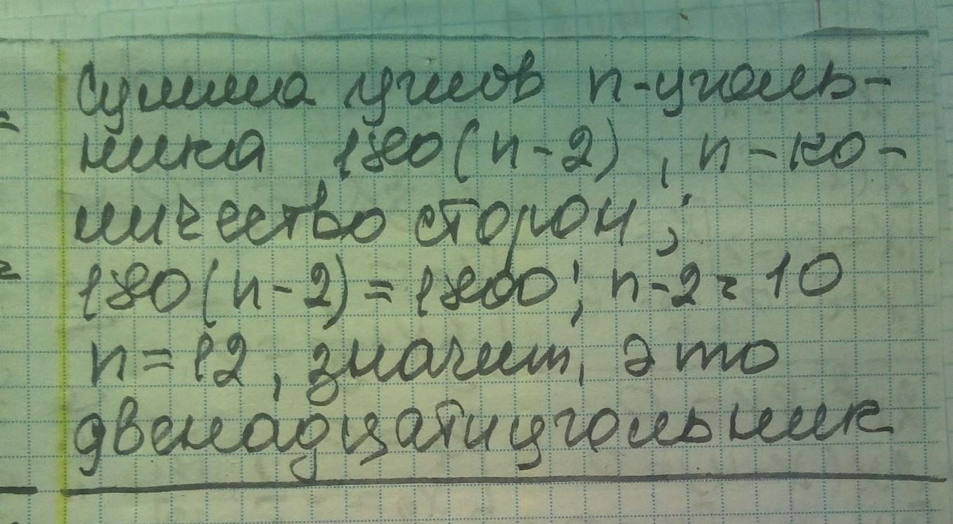1800 = 180 * ( n - 2 ) ; 10 = n - 2 ; n = 12 . Ответ: число сторон в многоугольнике равно 12 .