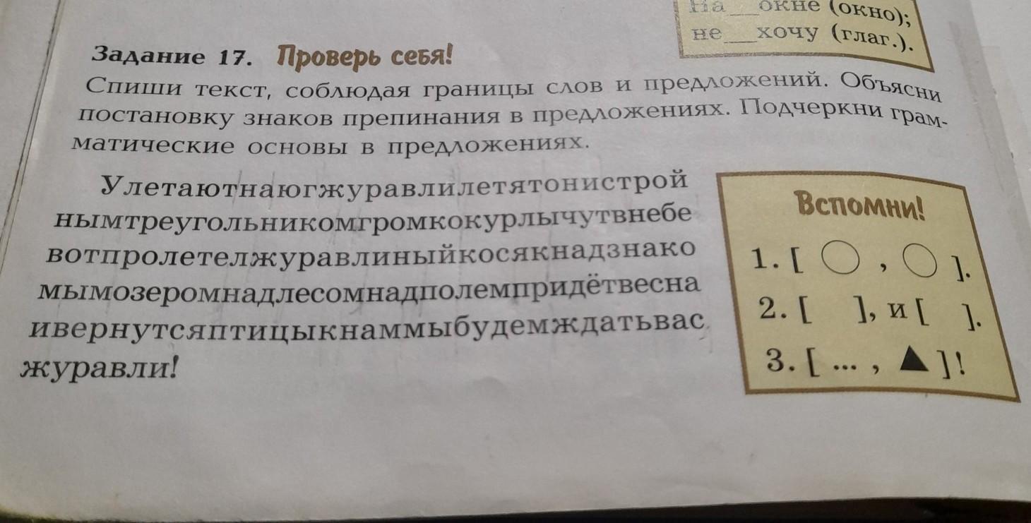 Улетают на юг журавли. Летят они стройным треугольником. Громко курлычут в небе. Вот пролетел журавлиный косяк. Над знакомым озером, над лесом, над полем. Придёт весна и вернутся птицы к нам. Мы будем ждать вас, журавли!