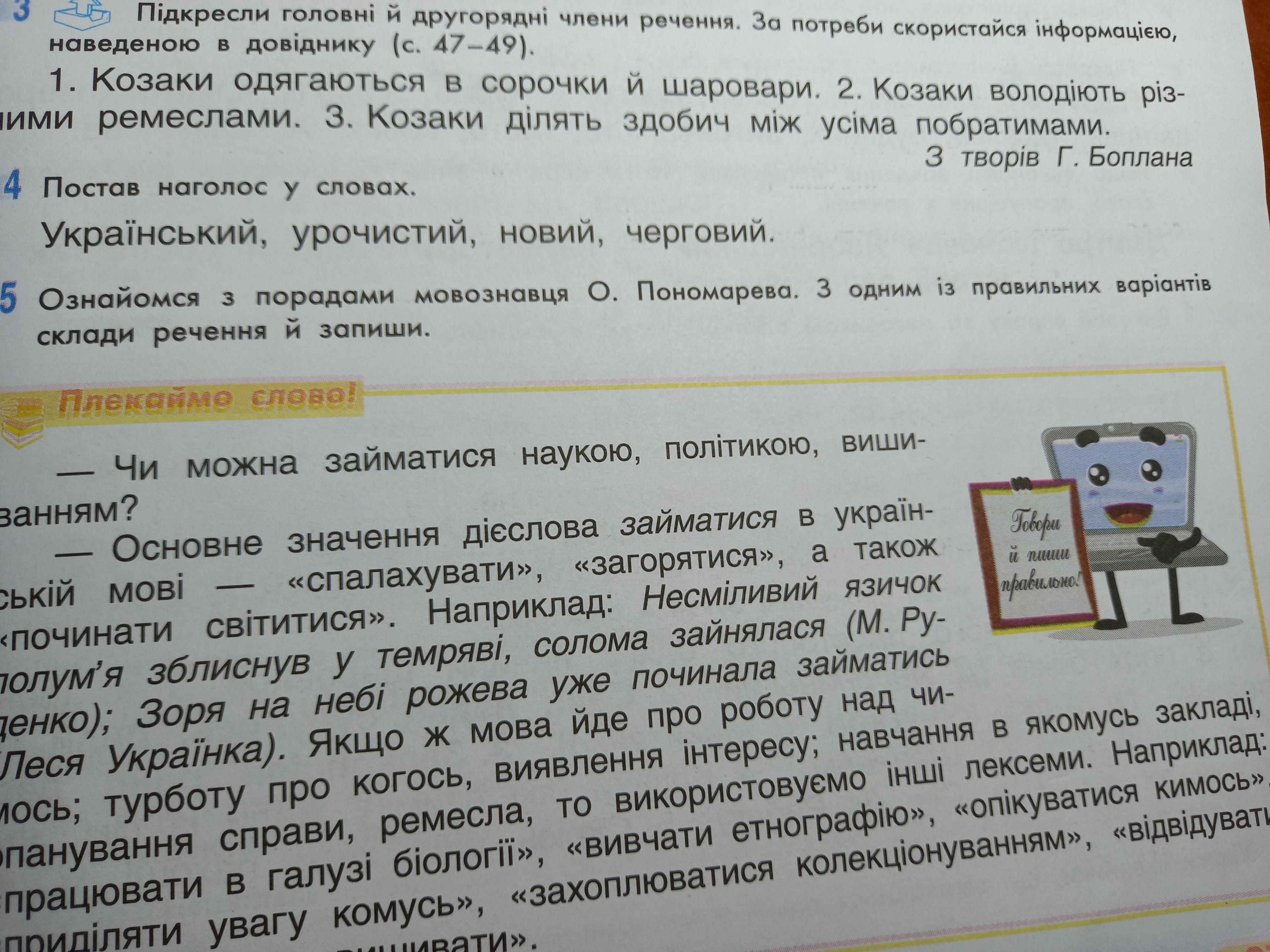 1.козаки (головний член) одягаються (другорядний член) в сорочки та шаровари. 2. козаки( головний) володіють (другорядний член) різними ремеслами. 3.Козаки (головний член) ділять (другорядний член) здобич між усіма побратимами