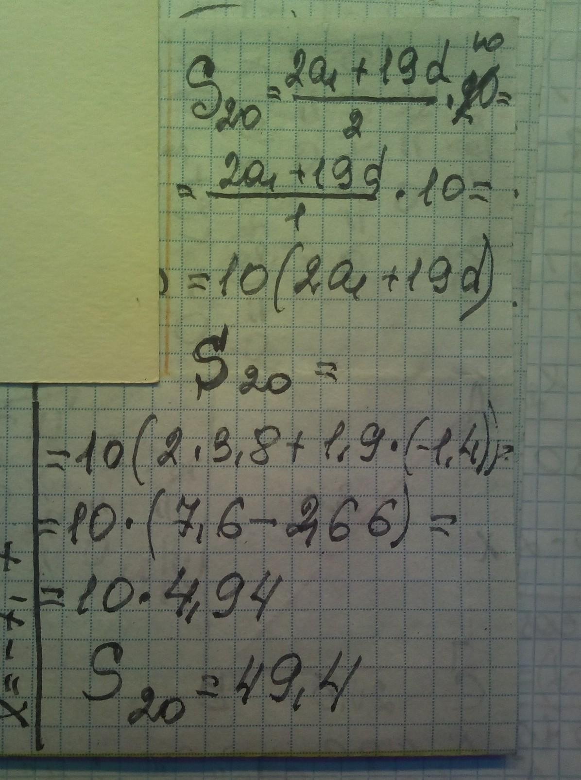 Знайдіть суму 20 перших членів арифметичної прогресії an, якщо а1=3,8, d=-1,4.​