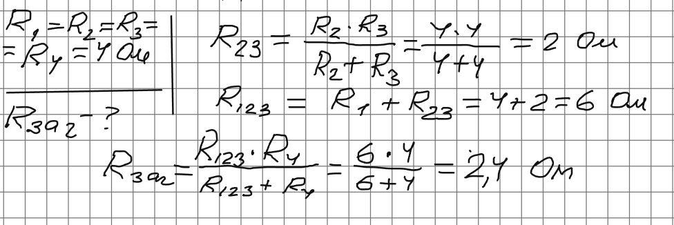 Всі резистори, з яких складається електричне коло, мають однаковий опір 4 Ом. Знайдіть загальний опір ділянки.