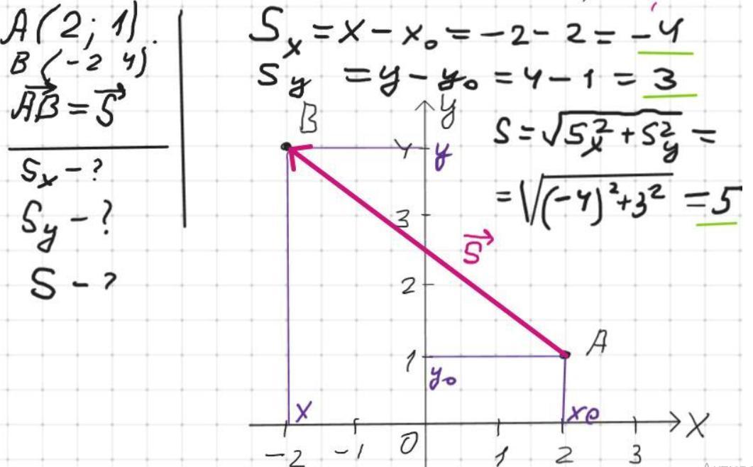 тіло здійснило переміщення із точки а з координатами(2м;1м) у точку в з координатами (-2м;4м) . накресліть вектор переміщення . визначте проекціі вектора переміщення на координатній осі ОХ і ОУ та його модуль