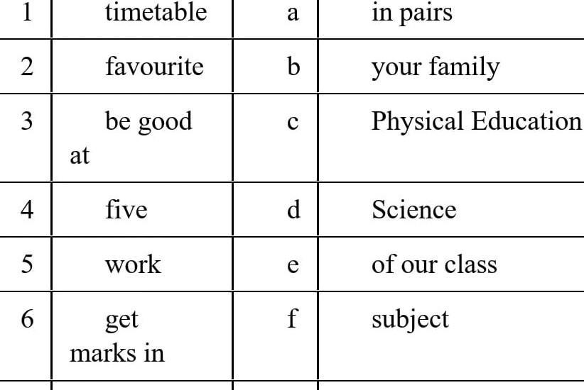 Exercise 7. Make combinations of words 1 timetable in pairs 2 your family 3 Physical Education 4 5 6 7 at favourite be good five work get marks in tell about a b C d e f g Science of our class subject times a week