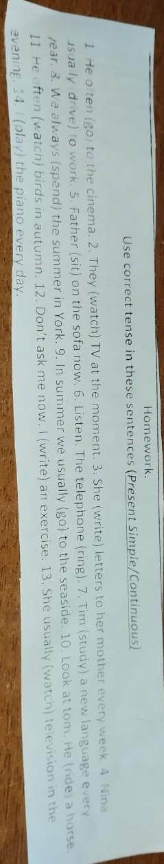 Homework. Use correct tense in these sentences (Present Simple/Continuous) 11.09.20 1 He often (go) to the cinema. 2. They (watch) TV at the moment. 3. She (write) letters to her mother every week. 4. Nina usually drive) to work. 5. Father (sit) on the sofa now. 6. Listen. The telephone (ring). 7. Tim (study) a new language every year. 3. We always (spend) the summer York. 9. In summer we usually (go) to the seaside. 10. Look at tom. He (ride) a horse. 11 He often (watch) birds in autumn. 12. Don't ask me now. I (write) an exercise. 13. She usually (watch) television in the evening. 14. (play) the piano every day. Помогите пожалуйста даю 50 балов