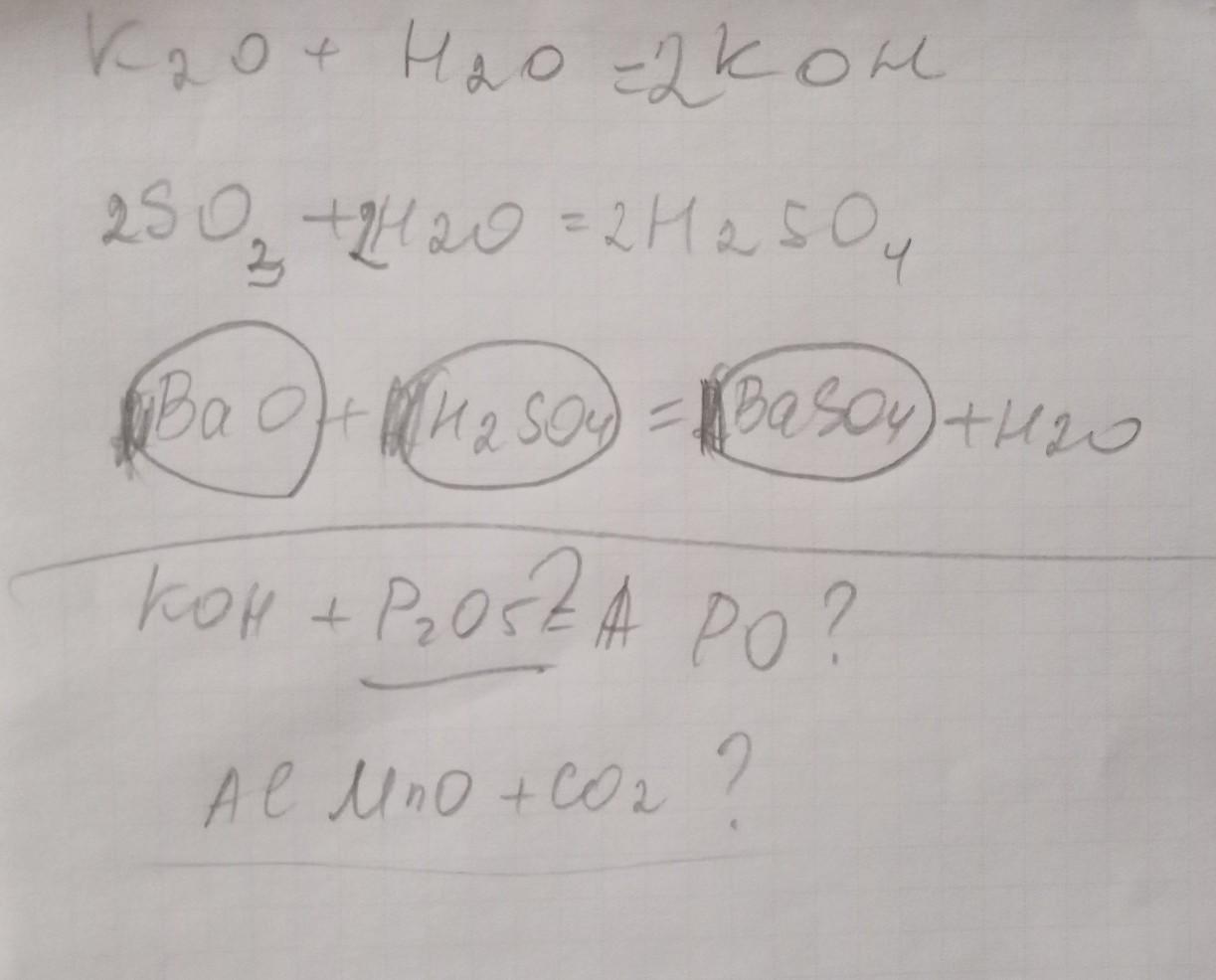 a) K₂O+H₂O=. 6) SO,+H₂O=. s} BaO+H_SO, п) КОН+РО = Al MgO+CO₂=.