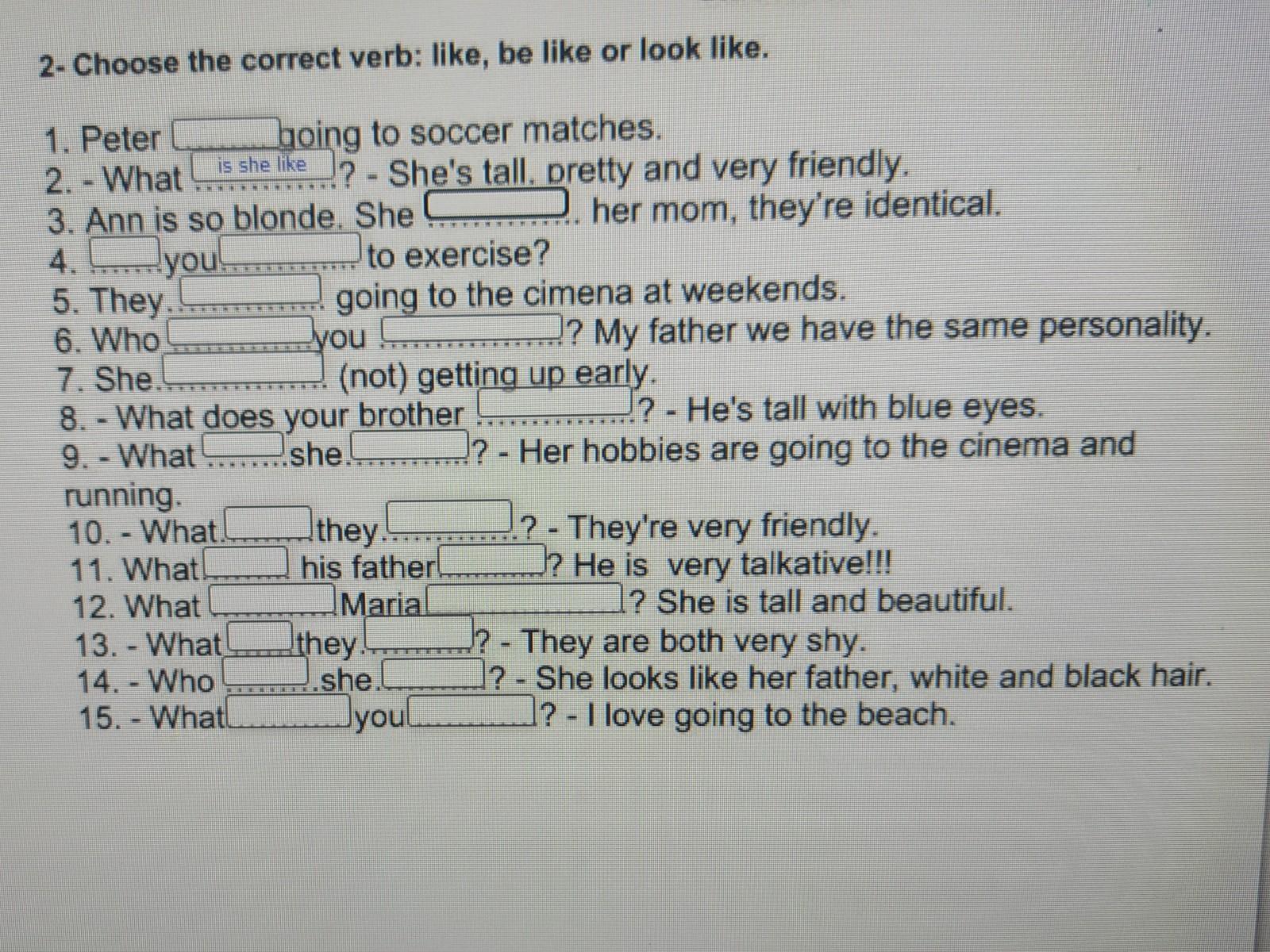 1. likes 3.lioks like 4. Do you like to exercise? 5. They like going... 6.Who do you look like? 7. She doesn't like getting up early. 8. What does your brother look like? 9. What does she like? 10. What are they like? 11. What is his father like? 12. What is Maria like? 13. What are they like? 14. What does she look like? 15. What do you like?
