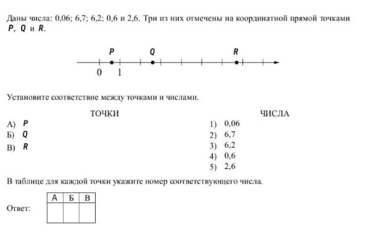 даны числа : 0,06; 6,7; 6,2; 0,6; и 2,6.Три из них отмечены на координатной прямой точками P, Q и R.Установите соответствие между точками и числами