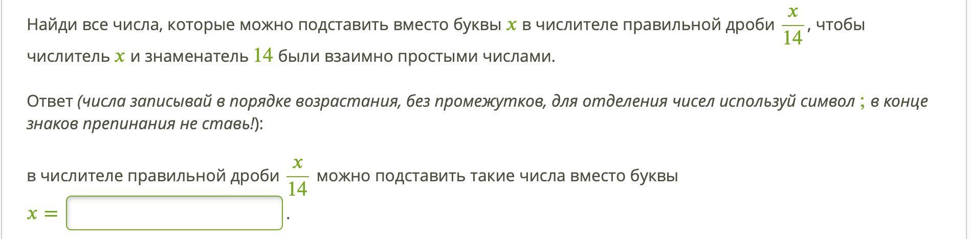 3, 5, 9, 11, 13, 15, 17, 19, 23, 25, 27, 29, 31, 33, 37, 39, 41 и т.д. ... все числа, не имеющих общих делителей с 14, кроме 1 (т.е. любые, которые нельзя поделить нацело на 2, 7, 14 нам подойдут)