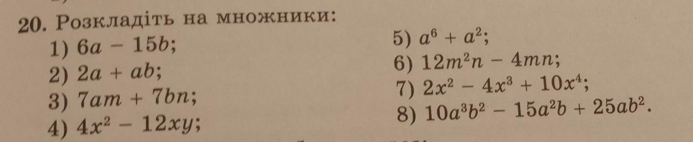 20. Розкладіть на множники: 1) 6a - 15b