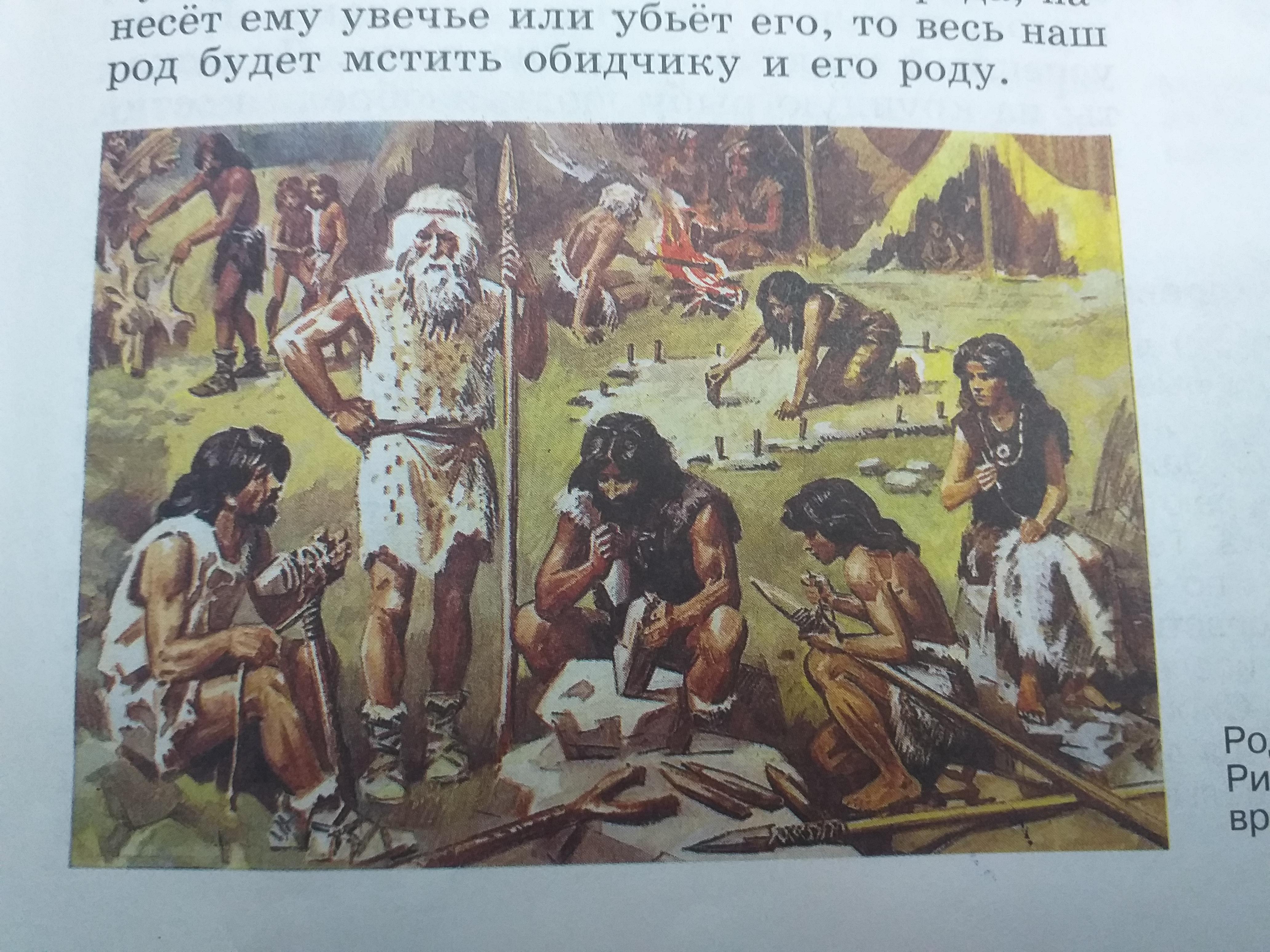 На изображении мы можем увидеть людей в древние времена. По количеству людей можем понять, что это целое племя. Каждая группа людей на этом изображении занимается чем-то. Кто-то занимается созданием оружия, кто-то готовит еду. Самая ближняя группа людей, скорее всего , готовится к охоте.