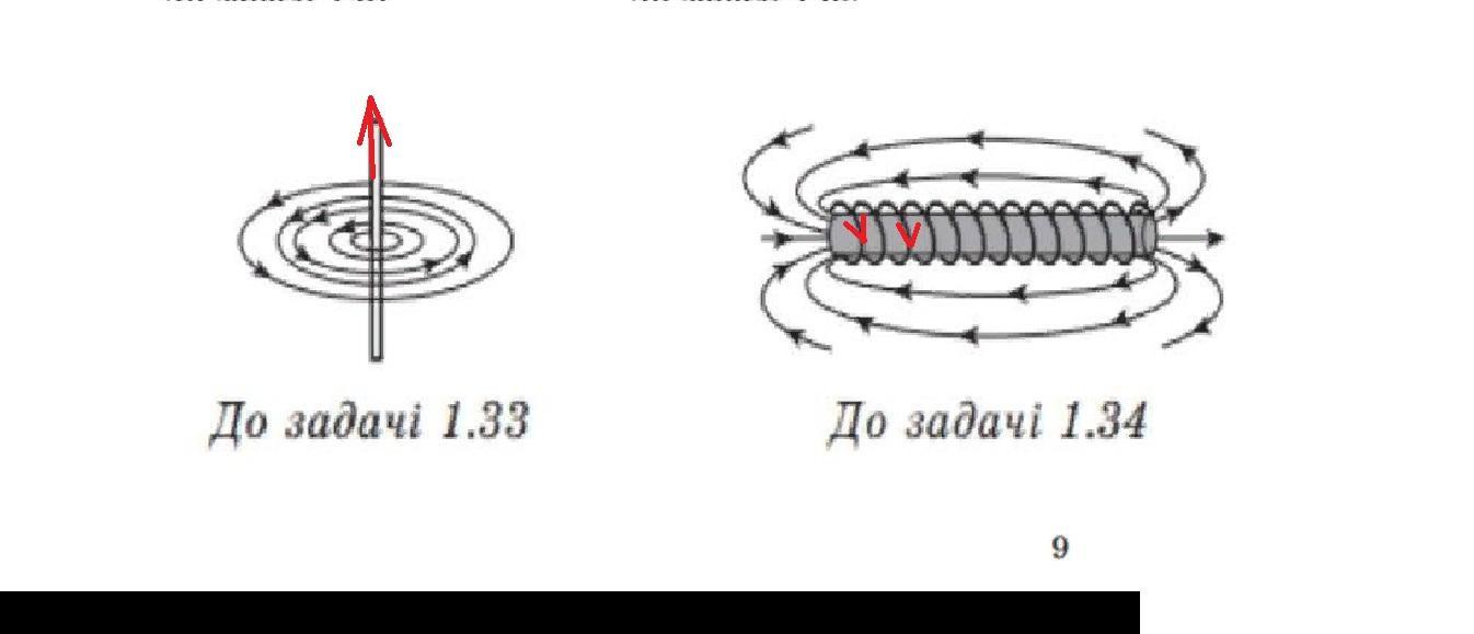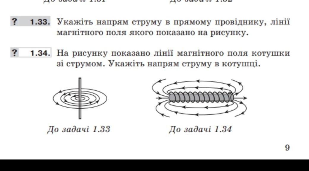 1.33. Укажіть напрям струму в прямому провіднику, лінії магнітного поля якого показано на рисунку. 1.34. На рисунку показано лінії магнітного поля котушки зі струмом. Укажіть напрям струму в котушці. រន кера До задачi 1.33 До задачi 1.34