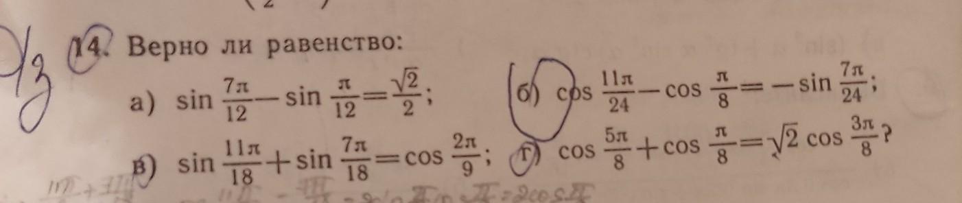 а) sin7π/12 -sinπ/12 =2sin(7π/12-π/12)/2*cos(7π/12+π/12)/2=2sinπ/4*cosπ/3 =2*√(2/2)*1/2 =√2/2 . Да.