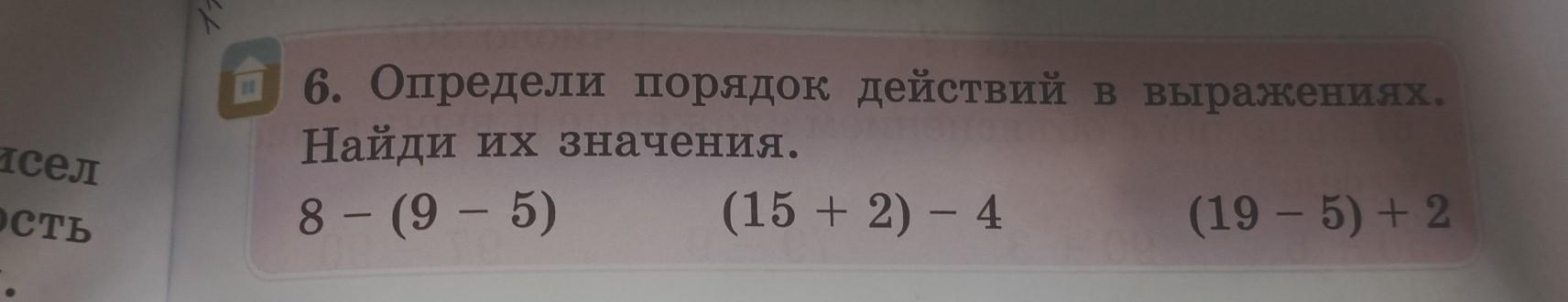 6. Определи порядок действий в выражениях. Найди их значения. 8-(9-5) (15-2) - 4 помог (19-5)+2. помогите пж. пж пж пж пж