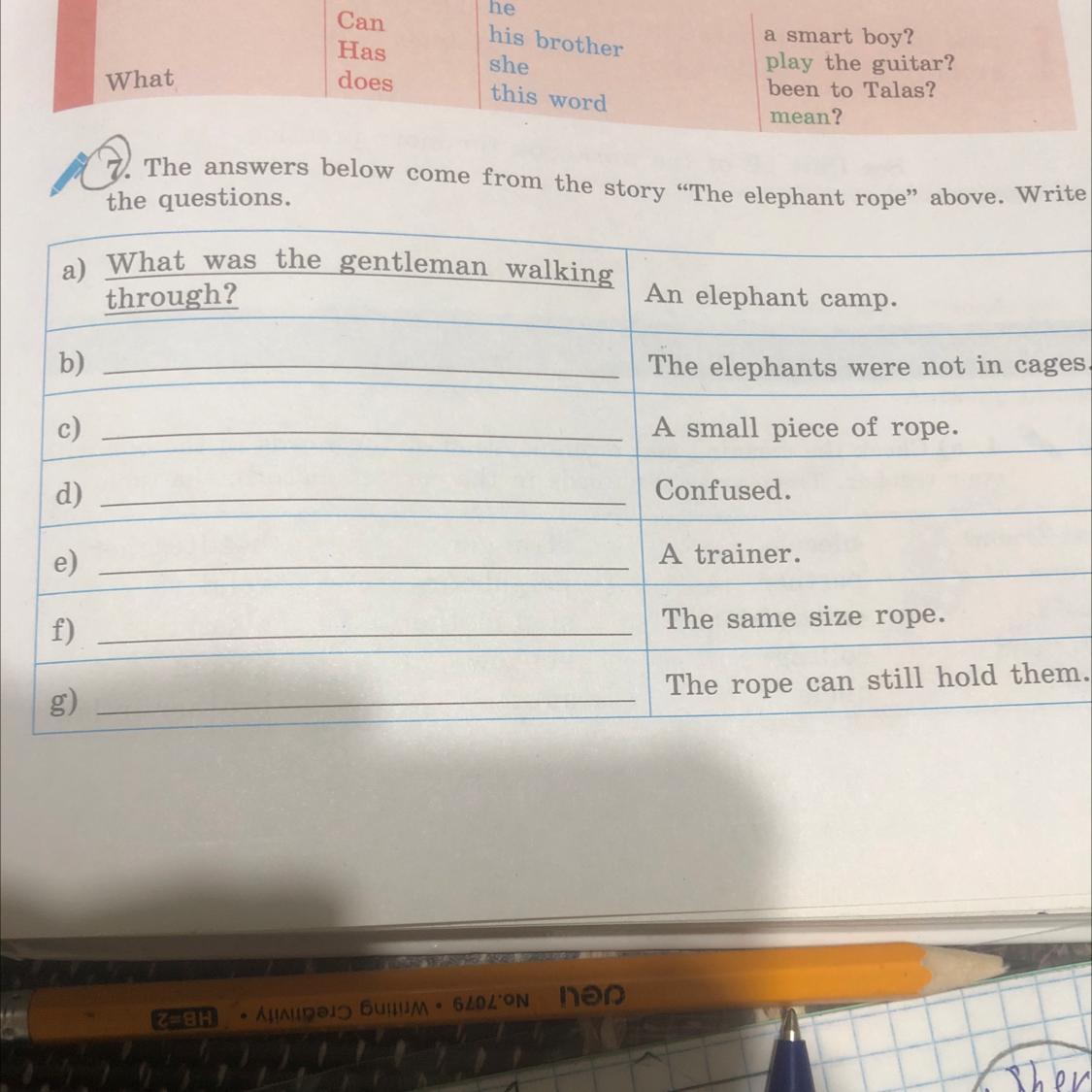 Даны ответы, к ним нужно составить вопросы (по тексту The elephant rope)
