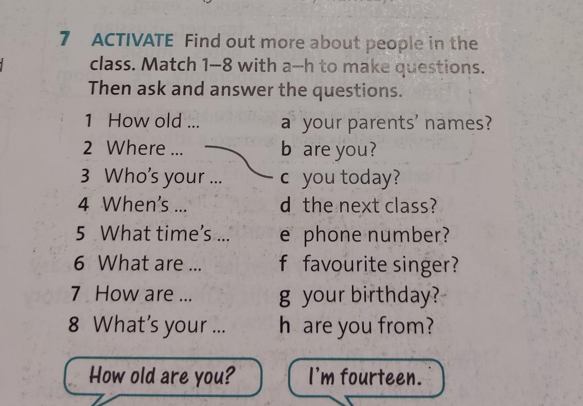 How old are you? Where are you from? Who's your favourite singer? When's your birthday? What time's the next class? What are your parents' names? How are you today? What's your phone number?