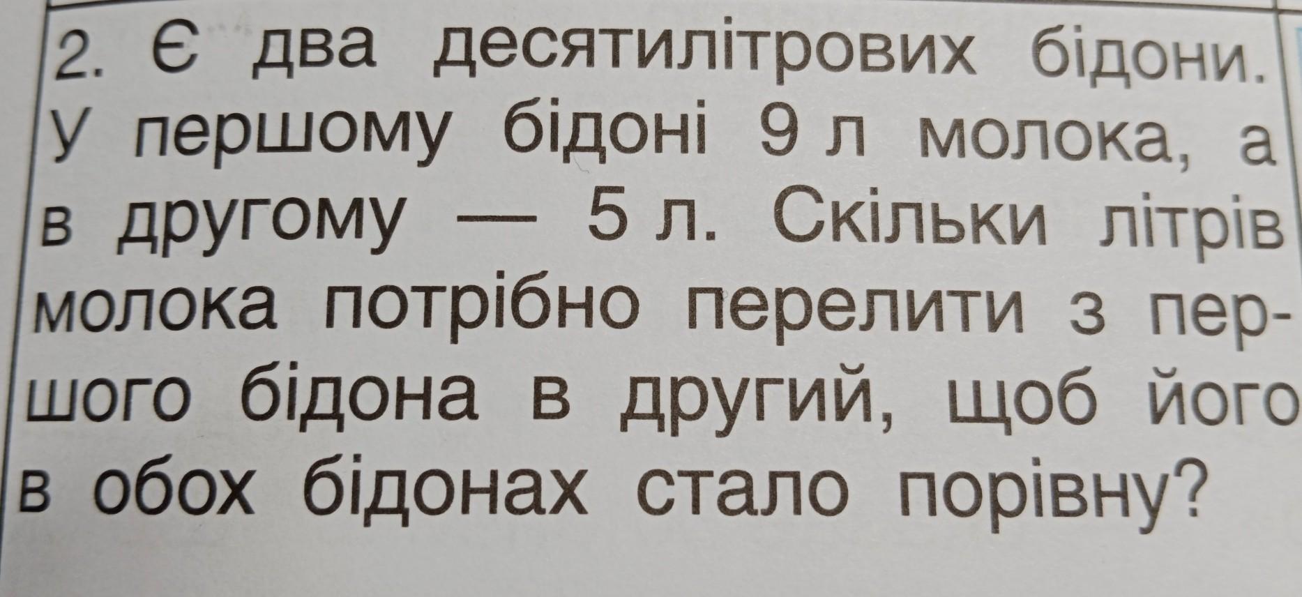- 2. Є два десятилітрових бідони. у першому бідоні 9 л молока, а в другому - 5 л. Скільки літрів молока потрібно перелити з пер- шого бідона в другий, щоб його в обох бідонах стало порівну?