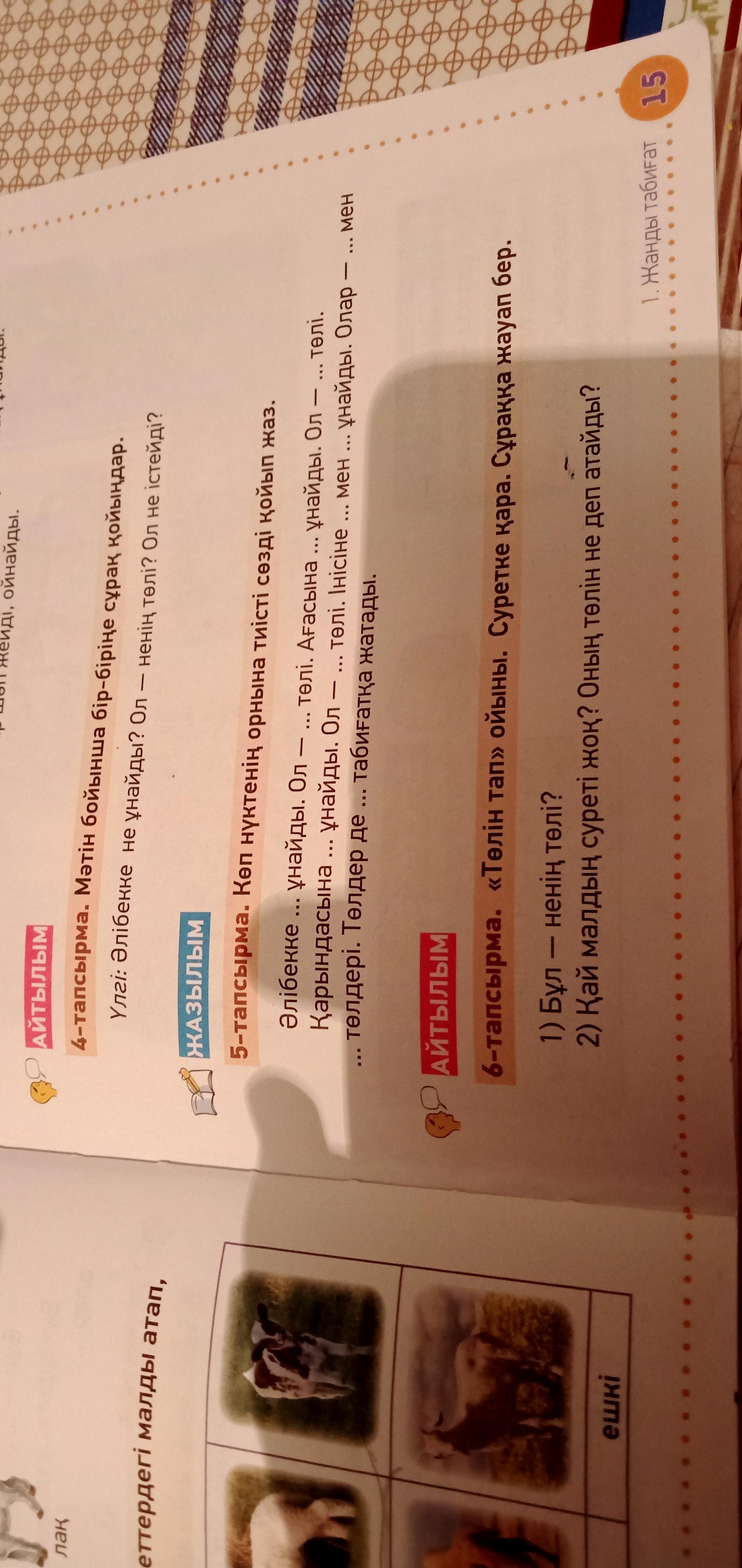 Әлібекке сиыр ұнайды. Ол төлі бұзау. Ағасына жылқы ұнайды. Ол төлі құлын. Қарындасына әтеш ұнайды. Ол төлі тауық. Інісіне ешкі мен қой ұнайды. Ол төлі лақ пен ешкі төлдірі. Төлдерде жанды табиғатқа жатады.