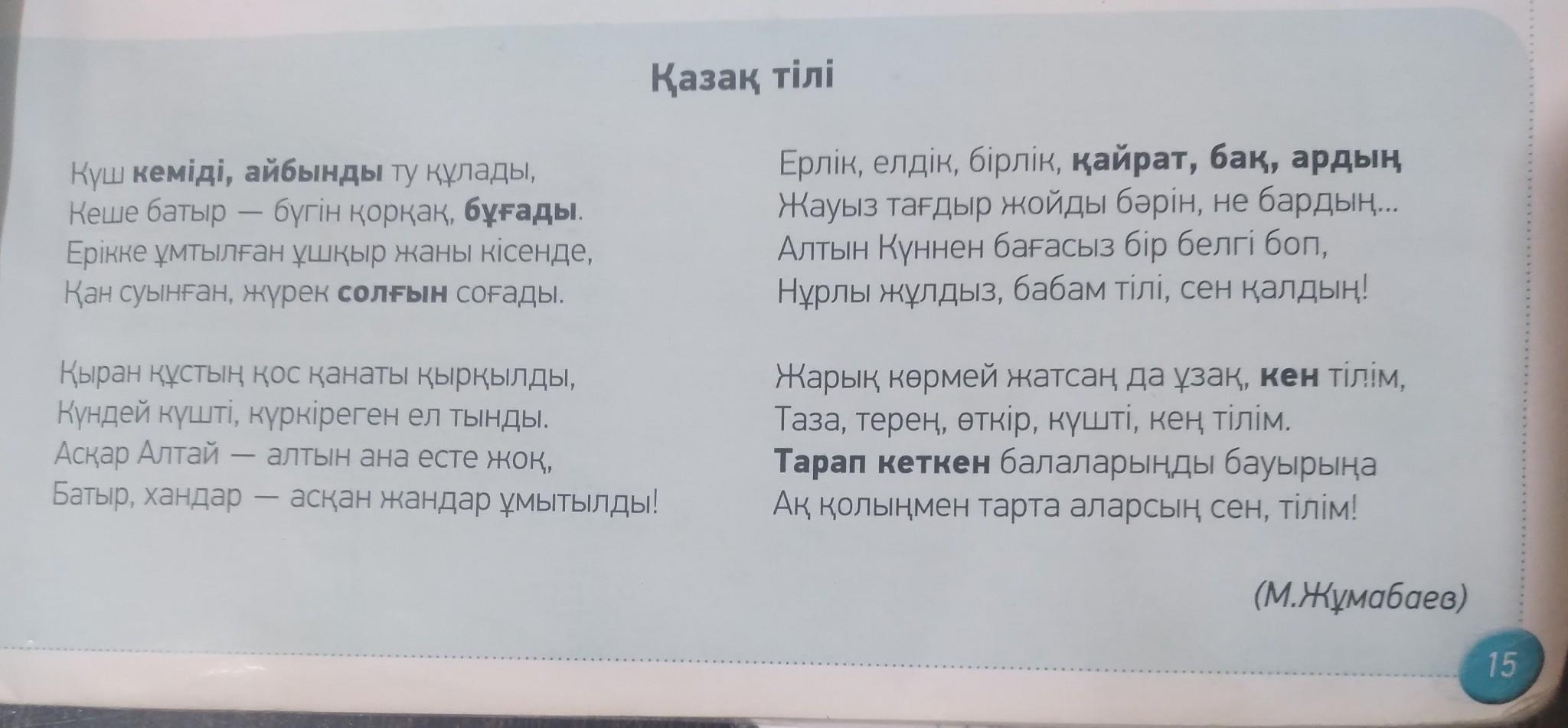 Өлең мәтініндегі қою қаріппен жазылған сөздерді дәптеріңе жаз. Олардың мағынасын Қазақ тілінің түсіндірме сөздігін пайдаланып анықта.