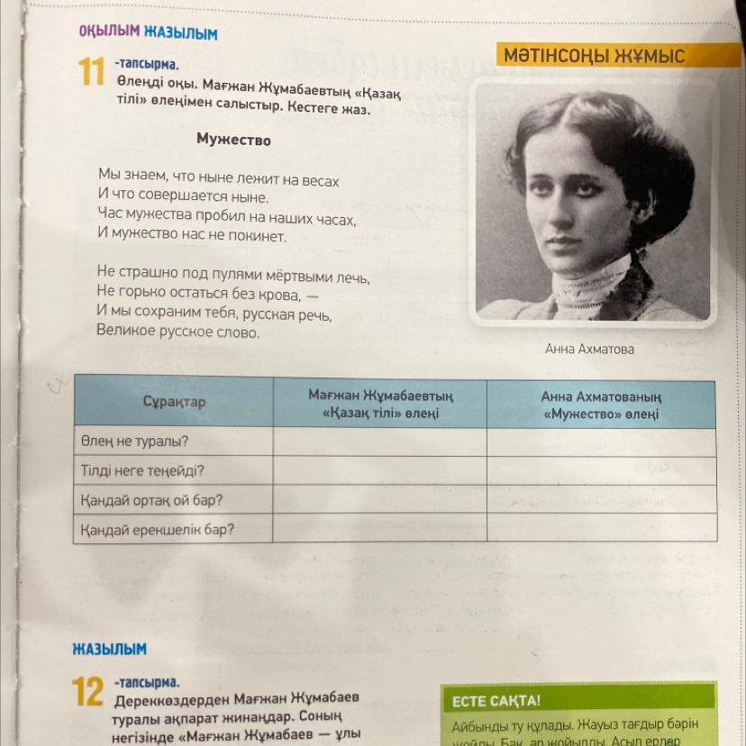Оленды окы, Магжан жумабаевтын казак тылы оленымен салыстыр. Кестеге жаз. Сурактар олен не туралы? Тылды неге тенейды?